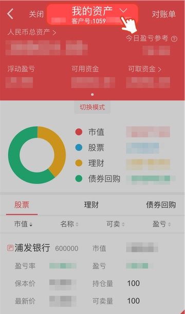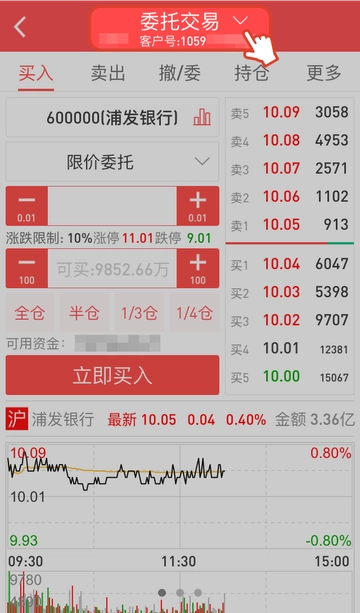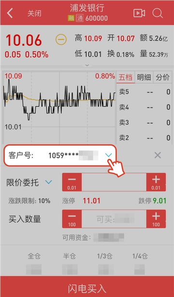 1“普通交易”“两融交易”“我的资产”“闪电交易”以及“新股申购”页面均已支持多账户切换,在交易页面即可进行账户切换。