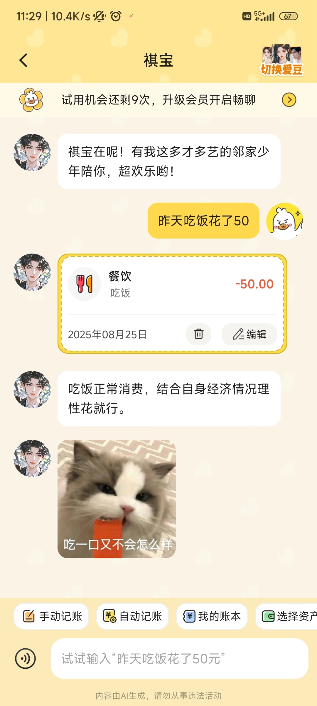 不想打字?那不妨尝试一下语音记账吧。只需发送记账语音信息,系统就能智能识别,快速完成记账操作,真正解放双手,让记账变得更加轻松省力!