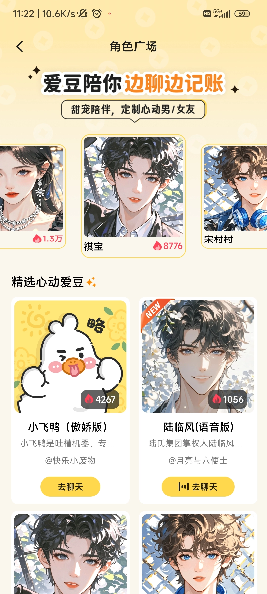 1、打开飞鸭AI记账app,先选择一个自己喜欢的角色,点击【去聊天】
