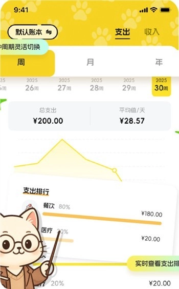 3、通过提供趋势图、饼图、柱状图等多维度的数据分析方式,使消费去向清晰直观,一看便知。