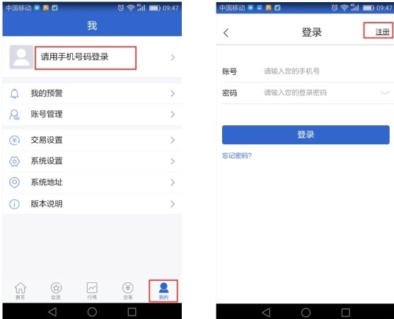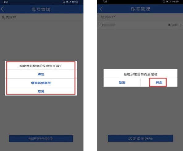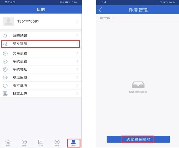 绑定交易账号:点击我的,账号管理,绑定资金账号,可以选择绑定当前的交易账号也可以选择绑定其他账号,根据提示操作即可(只需要操作一次)