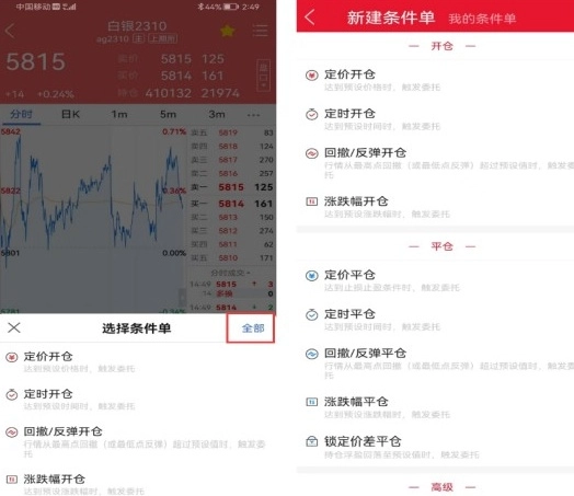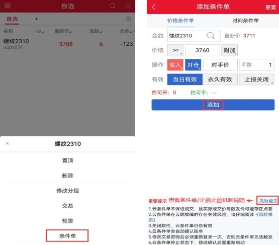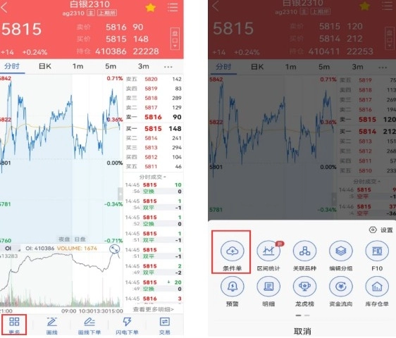 完成绑定操作后,于分时图或者K线图上点击“更多”选项,接着从弹出的内容里选择条件单,或者选择已添加至自选的合约。