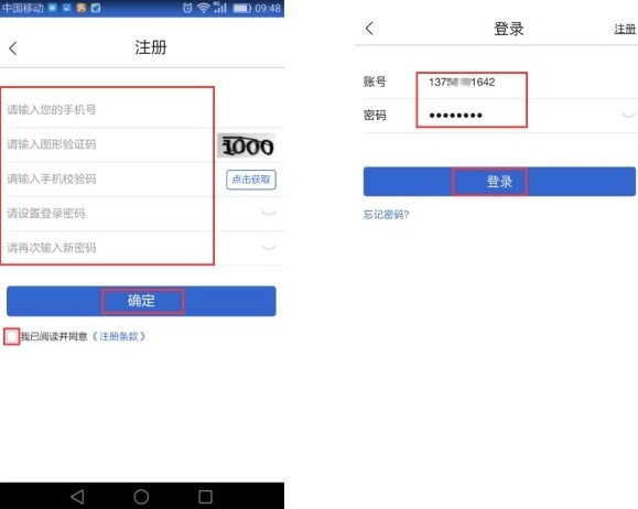 输入手机号、验证码、设置密码,勾选我已阅读,点击确定。输入注册好的手机号码、登录密码,点击登录