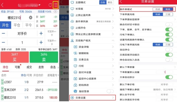 下单界面,点击右上角菜单栏,选择交易设置,切换条件单模式为高级